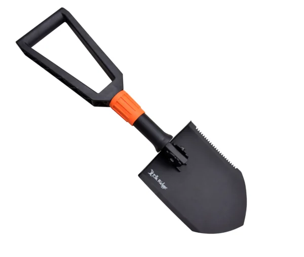 SPECIAL FEATURES: Foldable Shovel/Entrenching Tool – Black Carbon Steel Blade with One Serrated Edge, Steel Tube with Injection Molded Nylon Fiber Handle. Measures 23-inches Overall.