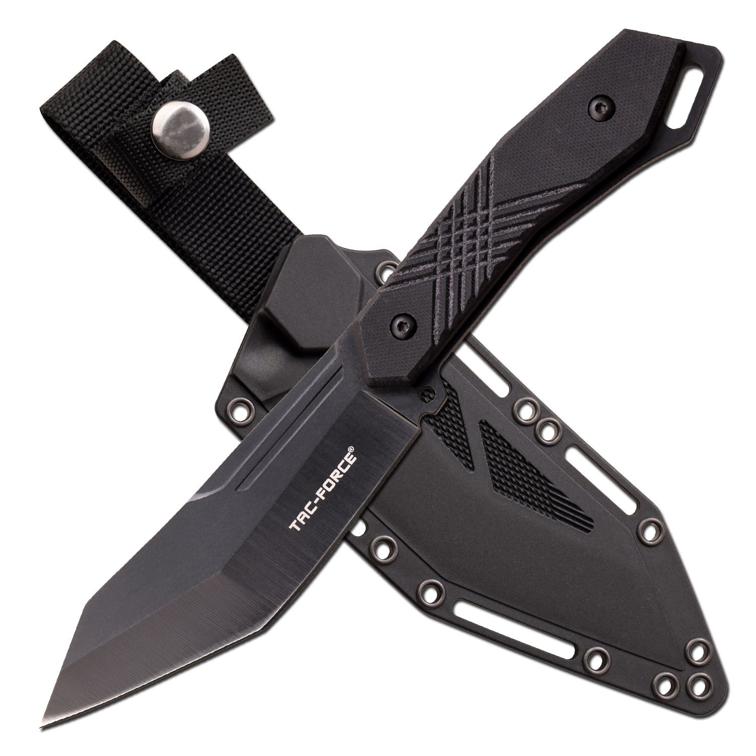 Wide, wedge-shaped fixed blade knife from Tac-Force. It comes with a multi-angled edge and a modified tanto point that’s heavily reinforced by the spine. The blade is high flat ground and comes with a very slight first finger guard.
