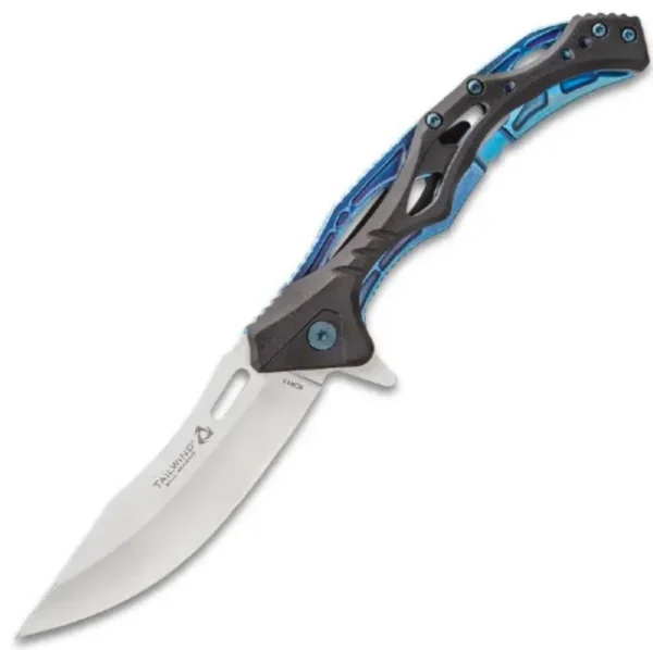 The Rampage Blue Tailwind Ball Bearing Pocket Knife has an aerodynamic inspired design that is not only visually appealing but comfortable in the hand. It has a 3 1/2” stainless steel upswept blade with a satin finish and a flipper to activate the ball bearing opening. The metallic blue and black handle is crafted of aluminum and steel, giving it a lightweight feel with an ergonomic grip. The pocket knife is 3.10 oz. The 8” overall pocket knife is 4 3/4”, when closed, and has a sturdy, black stainless steel pocket clip for ease of carry.